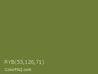 RYB 53,126,71 Color is a normal lime color and the nearest color is Crete #737829. Hex code #6c7e35 and RGB value is rgb(108,126,53). In RGB color space, this color is composed of 42% red, 49% green, 21% blue, In CMYK color space, this color is composed of 14% cyan, 0% magenta, 58% yellow , 51% black , In HSL color space, this color has a hue angle of 75° , 41% saturation and 35% lightness.