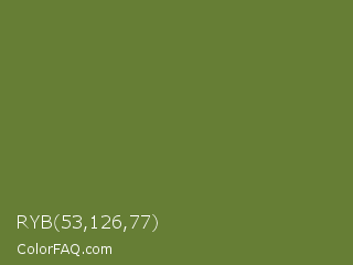 RYB 53,126,77 Color is a normal green color and the nearest color is Maximum Green #5e8c31. Hex code #667e35 and RGB value is rgb(102,126,53). In RGB color space, this color is composed of 40% red, 49% green, 21% blue, In CMYK color space, this color is composed of 19% cyan, 0% magenta, 58% yellow , 51% black , In HSL color space, this color has a hue angle of 80° , 41% saturation and 35% lightness.