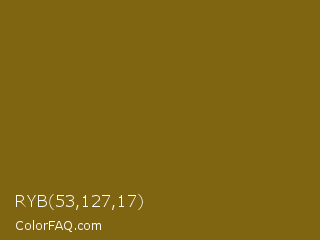 RYB 53,127,17 Color is a dark orange color and the nearest color is Yukon Gold #7b6608. Hex code #7f6411 and RGB value is rgb(127,100,17). In RGB color space, this color is composed of 50% red, 39% green, 7% blue, In CMYK color space, this color is composed of 0% cyan, 21% magenta, 87% yellow , 50% black , In HSL color space, this color has a hue angle of 45° , 76% saturation and 28% lightness.