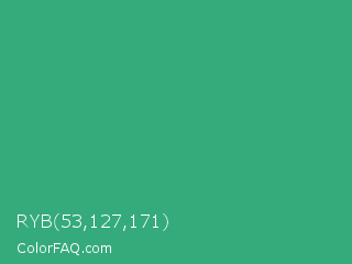 RYB 53,127,171 Color is a normal green color and the nearest color is Ocean Green #41aa78. Hex code #35ab7b and RGB value is rgb(53,171,123). In RGB color space, this color is composed of 21% red, 67% green, 48% blue, In CMYK color space, this color is composed of 69% cyan, 0% magenta, 28% yellow , 33% black , In HSL color space, this color has a hue angle of 156° , 53% saturation and 44% lightness.