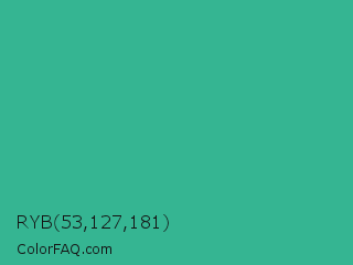 RYB 53,127,181 Color is a normal cyan color and the nearest color is Mountain Meadow #30ba8f. Hex code #35b592 and RGB value is rgb(53,181,146). In RGB color space, this color is composed of 21% red, 71% green, 57% blue, In CMYK color space, this color is composed of 71% cyan, 0% magenta, 19% yellow , 29% black , In HSL color space, this color has a hue angle of 164° , 55% saturation and 46% lightness.
