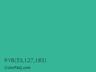 RYB 53,127,183 Color is a normal cyan color and the nearest color is Mountain Meadow #30ba8f. Hex code #35b797 and RGB value is rgb(53,183,151). In RGB color space, this color is composed of 21% red, 72% green, 59% blue, In CMYK color space, this color is composed of 71% cyan, 0% magenta, 17% yellow , 28% black , In HSL color space, this color has a hue angle of 165° , 55% saturation and 46% lightness.