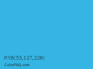 RYB 53,127,228 Color is a normal blue color and the nearest color is Picton Blue #45b1e8. Hex code #35b5e4 and RGB value is rgb(53,181,228). In RGB color space, this color is composed of 21% red, 71% green, 89% blue, In CMYK color space, this color is composed of 77% cyan, 21% magenta, 0% yellow , 11% black , In HSL color space, this color has a hue angle of 196° , 76% saturation and 55% lightness.