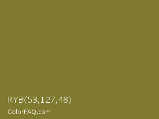 RYB 53,127,48 Color is a normal yellow color and the nearest color is Pesto #7c7631. Hex code #7f7a30 and RGB value is rgb(127,122,48). In RGB color space, this color is composed of 50% red, 48% green, 19% blue, In CMYK color space, this color is composed of 0% cyan, 4% magenta, 62% yellow , 50% black , In HSL color space, this color has a hue angle of 56° , 45% saturation and 34% lightness.