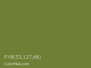 RYB 53,127,68 Color is a normal lime color and the nearest color is Crete #737829. Hex code #707f35 and RGB value is rgb(112,127,53). In RGB color space, this color is composed of 44% red, 50% green, 21% blue, In CMYK color space, this color is composed of 12% cyan, 0% magenta, 58% yellow , 50% black , In HSL color space, this color has a hue angle of 72° , 41% saturation and 35% lightness.