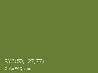 RYB 53,127,77 Color is a normal lime color and the nearest color is Maximum Green #5e8c31. Hex code #677f35 and RGB value is rgb(103,127,53). In RGB color space, this color is composed of 40% red, 50% green, 21% blue, In CMYK color space, this color is composed of 19% cyan, 0% magenta, 58% yellow , 50% black , In HSL color space, this color has a hue angle of 79° , 41% saturation and 35% lightness.