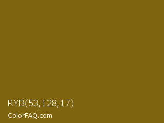 RYB 53,128,17 Color is a dark orange color and the nearest color is Yukon Gold #7b6608. Hex code #806511 and RGB value is rgb(128,101,17). In RGB color space, this color is composed of 50% red, 40% green, 7% blue, In CMYK color space, this color is composed of 0% cyan, 21% magenta, 87% yellow , 50% black , In HSL color space, this color has a hue angle of 45° , 77% saturation and 28% lightness.