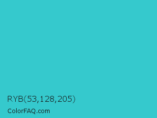 RYB 53,128,205 Color is a normal cyan color and the nearest color is Turquoise PWG #30d5c8. Hex code #35c9cd and RGB value is rgb(53,201,205). In RGB color space, this color is composed of 21% red, 79% green, 80% blue, In CMYK color space, this color is composed of 74% cyan, 2% magenta, 0% yellow , 20% black , In HSL color space, this color has a hue angle of 182° , 60% saturation and 51% lightness.