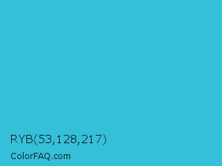 RYB 53,128,217 Color is a normal cyan color and the nearest color is Scooter #2ebfd4. Hex code #35bfd9 and RGB value is rgb(53,191,217). In RGB color space, this color is composed of 21% red, 75% green, 85% blue, In CMYK color space, this color is composed of 76% cyan, 12% magenta, 0% yellow , 15% black , In HSL color space, this color has a hue angle of 190° , 68% saturation and 53% lightness.
