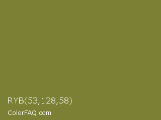 RYB 53,128,58 Color is a normal yellow color and the nearest color is Pesto #7c7631. Hex code #7b8035 and RGB value is rgb(123,128,53). In RGB color space, this color is composed of 48% red, 50% green, 21% blue, In CMYK color space, this color is composed of 4% cyan, 0% magenta, 59% yellow , 50% black , In HSL color space, this color has a hue angle of 64° , 41% saturation and 35% lightness.