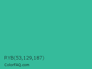 RYB 53,129,187 Color is a normal cyan color and the nearest color is Keppel #3ab09e. Hex code #35bb9b and RGB value is rgb(53,187,155). In RGB color space, this color is composed of 21% red, 73% green, 61% blue, In CMYK color space, this color is composed of 72% cyan, 0% magenta, 17% yellow , 27% black , In HSL color space, this color has a hue angle of 166° , 56% saturation and 47% lightness.