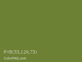 RYB 53,129,73 Color is a normal lime color and the nearest color is Crete #737829. Hex code #6d8135 and RGB value is rgb(109,129,53). In RGB color space, this color is composed of 43% red, 51% green, 21% blue, In CMYK color space, this color is composed of 16% cyan, 0% magenta, 59% yellow , 49% black , In HSL color space, this color has a hue angle of 76° , 42% saturation and 36% lightness.