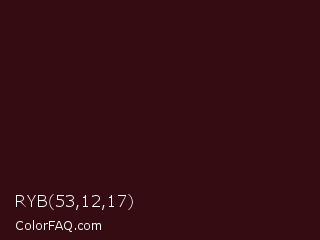 RYB 53,12,17 Color is a very dark red color and the nearest color is Aubergine #3b0910. Hex code #350c11 and RGB value is rgb(53,12,17). In RGB color space, this color is composed of 21% red, 5% green, 7% blue, In CMYK color space, this color is composed of 0% cyan, 77% magenta, 68% yellow , 79% black , In HSL color space, this color has a hue angle of 353° , 63% saturation and 13% lightness.