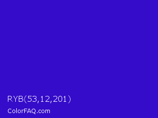 RYB 53,12,201 Color is a normal indigo color and the nearest color is Interdimensional Blue #360ccc. Hex code #350cc9 and RGB value is rgb(53,12,201). In RGB color space, this color is composed of 21% red, 5% green, 79% blue, In CMYK color space, this color is composed of 74% cyan, 94% magenta, 0% yellow , 21% black , In HSL color space, this color has a hue angle of 253° , 89% saturation and 42% lightness.