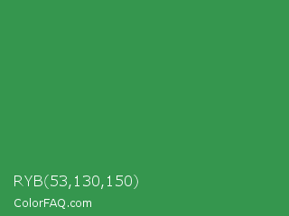 RYB 53,130,150 Color is a normal green color and the nearest color is Sea Green #2e8b57. Hex code #35964e and RGB value is rgb(53,150,78). In RGB color space, this color is composed of 21% red, 59% green, 31% blue, In CMYK color space, this color is composed of 65% cyan, 0% magenta, 48% yellow , 41% black , In HSL color space, this color has a hue angle of 135° , 48% saturation and 40% lightness.