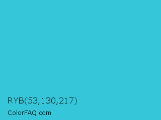 RYB 53,130,217 Color is a normal cyan color and the nearest color is Scooter #2ebfd4. Hex code #35c6d9 and RGB value is rgb(53,198,217). In RGB color space, this color is composed of 21% red, 78% green, 85% blue, In CMYK color space, this color is composed of 76% cyan, 9% magenta, 0% yellow , 15% black , In HSL color space, this color has a hue angle of 187° , 68% saturation and 53% lightness.