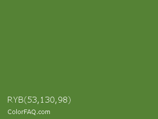 RYB 53,130,98 Color is a normal green color and the nearest color is Sap Green #507d2a. Hex code #558235 and RGB value is rgb(85,130,53). In RGB color space, this color is composed of 33% red, 51% green, 21% blue, In CMYK color space, this color is composed of 35% cyan, 0% magenta, 59% yellow , 49% black , In HSL color space, this color has a hue angle of 95° , 42% saturation and 36% lightness.