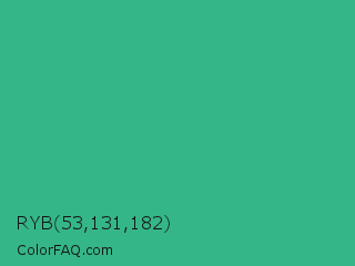 RYB 53,131,182 Color is a normal green color and the nearest color is Mountain Meadow #30ba8f. Hex code #35b689 and RGB value is rgb(53,182,137). In RGB color space, this color is composed of 21% red, 71% green, 54% blue, In CMYK color space, this color is composed of 71% cyan, 0% magenta, 25% yellow , 29% black , In HSL color space, this color has a hue angle of 159° , 55% saturation and 46% lightness.