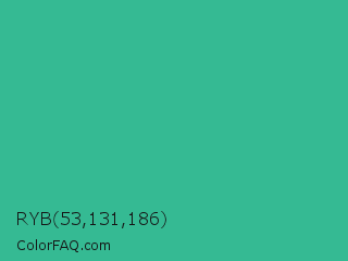 RYB 53,131,186 Color is a normal green color and the nearest color is Mountain Meadow #30ba8f. Hex code #35ba93 and RGB value is rgb(53,186,147). In RGB color space, this color is composed of 21% red, 73% green, 58% blue, In CMYK color space, this color is composed of 72% cyan, 0% magenta, 21% yellow , 27% black , In HSL color space, this color has a hue angle of 162° , 56% saturation and 47% lightness.
