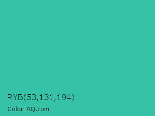 RYB 53,131,194 Color is a normal cyan color and the nearest color is Puerto Rico #3fc1aa. Hex code #35c2a7 and RGB value is rgb(53,194,167). In RGB color space, this color is composed of 21% red, 76% green, 65% blue, In CMYK color space, this color is composed of 73% cyan, 0% magenta, 14% yellow , 24% black , In HSL color space, this color has a hue angle of 169° , 57% saturation and 48% lightness.