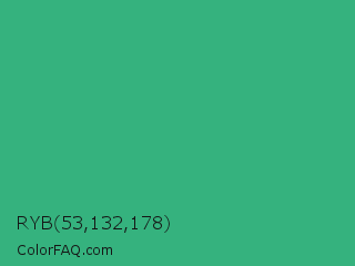 RYB 53,132,178 Color is a normal green color and the nearest color is Mint #3eb489. Hex code #35b27e and RGB value is rgb(53,178,126). In RGB color space, this color is composed of 21% red, 70% green, 49% blue, In CMYK color space, this color is composed of 70% cyan, 0% magenta, 29% yellow , 30% black , In HSL color space, this color has a hue angle of 155° , 54% saturation and 45% lightness.