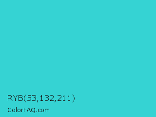 RYB 53,132,211 Color is a normal cyan color and the nearest color is Turquoise PWG #30d5c8. Hex code #35d3d3 and RGB value is rgb(53,211,211). In RGB color space, this color is composed of 21% red, 83% green, 83% blue, In CMYK color space, this color is composed of 75% cyan, 0% magenta, 0% yellow , 17% black , In HSL color space, this color has a hue angle of 180° , 64% saturation and 52% lightness.