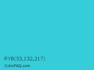RYB 53,132,217 Color is a normal cyan color and the nearest color is Scooter #2ebfd4. Hex code #35cdd9 and RGB value is rgb(53,205,217). In RGB color space, this color is composed of 21% red, 80% green, 85% blue, In CMYK color space, this color is composed of 76% cyan, 6% magenta, 0% yellow , 15% black , In HSL color space, this color has a hue angle of 184° , 68% saturation and 53% lightness.