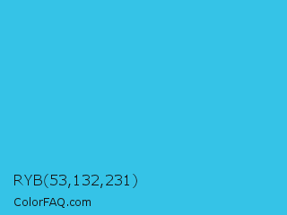 RYB 53,132,231 Color is a normal cyan color and the nearest color is Scooter #2ebfd4. Hex code #35c3e7 and RGB value is rgb(53,195,231). In RGB color space, this color is composed of 21% red, 76% green, 91% blue, In CMYK color space, this color is composed of 77% cyan, 16% magenta, 0% yellow , 9% black , In HSL color space, this color has a hue angle of 192° , 79% saturation and 56% lightness.