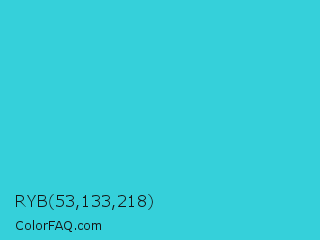 RYB 53,133,218 Color is a normal cyan color and the nearest color is Scooter #2ebfd4. Hex code #35d0da and RGB value is rgb(53,208,218). In RGB color space, this color is composed of 21% red, 82% green, 85% blue, In CMYK color space, this color is composed of 76% cyan, 5% magenta, 0% yellow , 15% black , In HSL color space, this color has a hue angle of 184° , 69% saturation and 53% lightness.