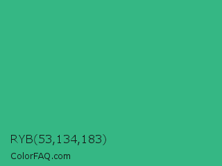 RYB 53,134,183 Color is a normal green color and the nearest color is Mint #3eb489. Hex code #35b784 and RGB value is rgb(53,183,132). In RGB color space, this color is composed of 21% red, 72% green, 52% blue, In CMYK color space, this color is composed of 71% cyan, 0% magenta, 28% yellow , 28% black , In HSL color space, this color has a hue angle of 156° , 55% saturation and 46% lightness.