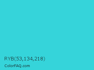 RYB 53,134,218 Color is a normal cyan color and the nearest color is Turquoise PWG #30d5c8. Hex code #35d4da and RGB value is rgb(53,212,218). In RGB color space, this color is composed of 21% red, 83% green, 85% blue, In CMYK color space, this color is composed of 76% cyan, 3% magenta, 0% yellow , 15% black , In HSL color space, this color has a hue angle of 182° , 69% saturation and 53% lightness.
