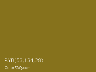 RYB 53,134,28 Color is a normal yellow color and the nearest color is Sand Dune #967117. Hex code #86721c and RGB value is rgb(134,114,28). In RGB color space, this color is composed of 53% red, 45% green, 11% blue, In CMYK color space, this color is composed of 0% cyan, 15% magenta, 79% yellow , 47% black , In HSL color space, this color has a hue angle of 49° , 65% saturation and 32% lightness.