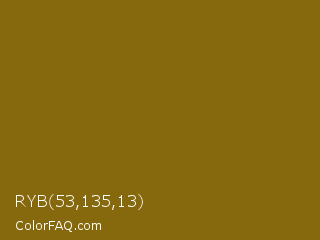 RYB 53,135,13 Color is a dark orange color and the nearest color is Corn Harvest #8b6b0b. Hex code #87690d and RGB value is rgb(135,105,13). In RGB color space, this color is composed of 53% red, 41% green, 5% blue, In CMYK color space, this color is composed of 0% cyan, 22% magenta, 90% yellow , 47% black , In HSL color space, this color has a hue angle of 45° , 82% saturation and 29% lightness.