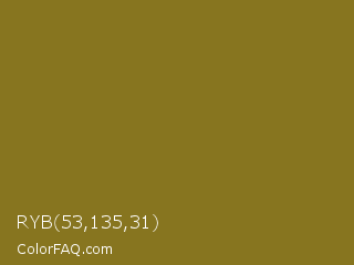 RYB 53,135,31 Color is a normal yellow color and the nearest color is Sand Dune #967117. Hex code #87751f and RGB value is rgb(135,117,31). In RGB color space, this color is composed of 53% red, 46% green, 12% blue, In CMYK color space, this color is composed of 0% cyan, 13% magenta, 77% yellow , 47% black , In HSL color space, this color has a hue angle of 50° , 63% saturation and 33% lightness.