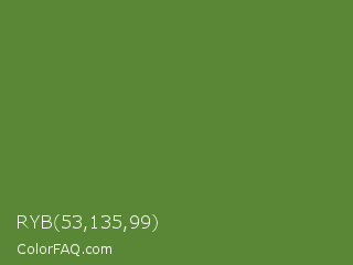RYB 53,135,99 Color is a normal green color and the nearest color is Maximum Green #5e8c31. Hex code #598735 and RGB value is rgb(89,135,53). In RGB color space, this color is composed of 35% red, 53% green, 21% blue, In CMYK color space, this color is composed of 34% cyan, 0% magenta, 61% yellow , 47% black , In HSL color space, this color has a hue angle of 94° , 44% saturation and 37% lightness.