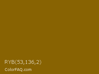RYB 53,136,2 Color is a dark orange color and the nearest color is Corn Harvest #8b6b0b. Hex code #886302 and RGB value is rgb(136,99,2). In RGB color space, this color is composed of 53% red, 39% green, 1% blue, In CMYK color space, this color is composed of 0% cyan, 27% magenta, 99% yellow , 47% black , In HSL color space, this color has a hue angle of 43° , 97% saturation and 27% lightness.