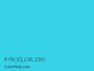 RYB 53,136,230 Color is a normal cyan color and the nearest color is Scooter #2ebfd4. Hex code #35d1e6 and RGB value is rgb(53,209,230). In RGB color space, this color is composed of 21% red, 82% green, 90% blue, In CMYK color space, this color is composed of 77% cyan, 9% magenta, 0% yellow , 10% black , In HSL color space, this color has a hue angle of 187° , 78% saturation and 55% lightness.