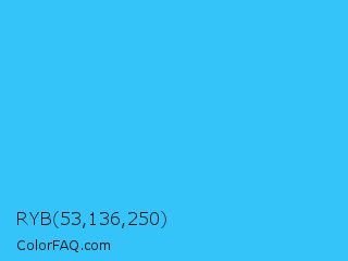 RYB 53,136,250 Color is a normal blue color and the nearest color is Picton Blue #45b1e8. Hex code #35c4fa and RGB value is rgb(53,196,250). In RGB color space, this color is composed of 21% red, 77% green, 98% blue, In CMYK color space, this color is composed of 79% cyan, 22% magenta, 0% yellow , 2% black , In HSL color space, this color has a hue angle of 196° , 95% saturation and 59% lightness.