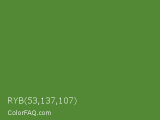 RYB 53,137,107 Color is a normal green color and the nearest color is Maximum Green #5e8c31. Hex code #538935 and RGB value is rgb(83,137,53). In RGB color space, this color is composed of 33% red, 54% green, 21% blue, In CMYK color space, this color is composed of 39% cyan, 0% magenta, 61% yellow , 46% black , In HSL color space, this color has a hue angle of 99° , 44% saturation and 37% lightness.