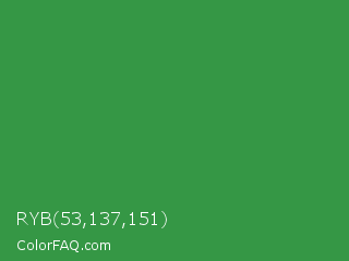 RYB 53,137,151 Color is a normal green color and the nearest color is Sea Green #2e8b57. Hex code #359745 and RGB value is rgb(53,151,69). In RGB color space, this color is composed of 21% red, 59% green, 27% blue, In CMYK color space, this color is composed of 65% cyan, 0% magenta, 54% yellow , 41% black , In HSL color space, this color has a hue angle of 130° , 48% saturation and 40% lightness.