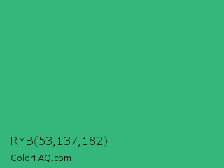 RYB 53,137,182 Color is a normal green color and the nearest color is Medium Sea Green #3cb371. Hex code #35b67a and RGB value is rgb(53,182,122). In RGB color space, this color is composed of 21% red, 71% green, 48% blue, In CMYK color space, this color is composed of 71% cyan, 0% magenta, 33% yellow , 29% black , In HSL color space, this color has a hue angle of 152° , 55% saturation and 46% lightness.