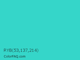RYB 53,137,214 Color is a normal cyan color and the nearest color is Turquoise PWG #30d5c8. Hex code #35d6c9 and RGB value is rgb(53,214,201). In RGB color space, this color is composed of 21% red, 84% green, 79% blue, In CMYK color space, this color is composed of 75% cyan, 0% magenta, 6% yellow , 16% black , In HSL color space, this color has a hue angle of 175° , 66% saturation and 52% lightness.