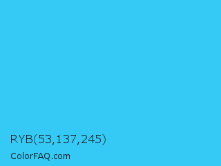RYB 53,137,245 Color is a normal cyan color and the nearest color is Picton Blue #45b1e8. Hex code #35caf5 and RGB value is rgb(53,202,245). In RGB color space, this color is composed of 21% red, 79% green, 96% blue, In CMYK color space, this color is composed of 78% cyan, 18% magenta, 0% yellow , 4% black , In HSL color space, this color has a hue angle of 193° , 91% saturation and 58% lightness.