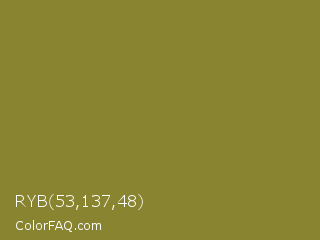 RYB 53,137,48 Color is a normal yellow color and the nearest color is Old Moss Green #867e36. Hex code #898430 and RGB value is rgb(137,132,48). In RGB color space, this color is composed of 54% red, 52% green, 19% blue, In CMYK color space, this color is composed of 0% cyan, 4% magenta, 65% yellow , 46% black , In HSL color space, this color has a hue angle of 57° , 48% saturation and 36% lightness.