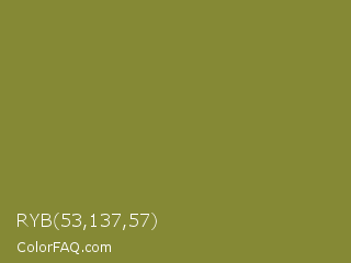 RYB 53,137,57 Color is a normal yellow color and the nearest color is Old Moss Green #867e36. Hex code #858935 and RGB value is rgb(133,137,53). In RGB color space, this color is composed of 52% red, 54% green, 21% blue, In CMYK color space, this color is composed of 3% cyan, 0% magenta, 61% yellow , 46% black , In HSL color space, this color has a hue angle of 63° , 44% saturation and 37% lightness.