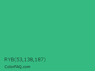 RYB 53,138,187 Color is a normal green color and the nearest color is Mint #3eb489. Hex code #35bb82 and RGB value is rgb(53,187,130). In RGB color space, this color is composed of 21% red, 73% green, 51% blue, In CMYK color space, this color is composed of 72% cyan, 0% magenta, 30% yellow , 27% black , In HSL color space, this color has a hue angle of 154° , 56% saturation and 47% lightness.
