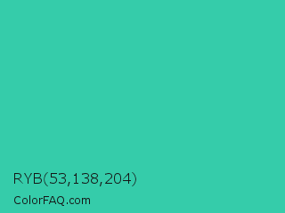 RYB 53,138,204 Color is a normal cyan color and the nearest color is Puerto Rico #3fc1aa. Hex code #35ccaa and RGB value is rgb(53,204,170). In RGB color space, this color is composed of 21% red, 80% green, 67% blue, In CMYK color space, this color is composed of 74% cyan, 0% magenta, 17% yellow , 20% black , In HSL color space, this color has a hue angle of 166° , 60% saturation and 50% lightness.