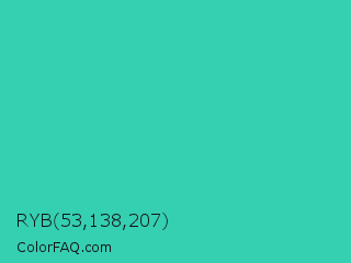 RYB 53,138,207 Color is a normal cyan color and the nearest color is Puerto Rico #3fc1aa. Hex code #35cfb2 and RGB value is rgb(53,207,178). In RGB color space, this color is composed of 21% red, 81% green, 70% blue, In CMYK color space, this color is composed of 74% cyan, 0% magenta, 14% yellow , 19% black , In HSL color space, this color has a hue angle of 169° , 62% saturation and 51% lightness.