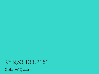 RYB 53,138,216 Color is a normal cyan color and the nearest color is Turquoise PWG #30d5c8. Hex code #35d8cb and RGB value is rgb(53,216,203). In RGB color space, this color is composed of 21% red, 85% green, 80% blue, In CMYK color space, this color is composed of 75% cyan, 0% magenta, 6% yellow , 15% black , In HSL color space, this color has a hue angle of 175° , 68% saturation and 53% lightness.