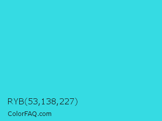 RYB 53,138,227 Color is a normal cyan color and the nearest color is Turquoise #40e0d0. Hex code #35dbe3 and RGB value is rgb(53,219,227). In RGB color space, this color is composed of 21% red, 86% green, 89% blue, In CMYK color space, this color is composed of 77% cyan, 4% magenta, 0% yellow , 11% black , In HSL color space, this color has a hue angle of 183° , 76% saturation and 55% lightness.